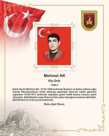 Şeh t Ulş.Er Mehmet AK, 16.02.1950 tar h nde İbrah m ve Zehra ç ft n n oğlu