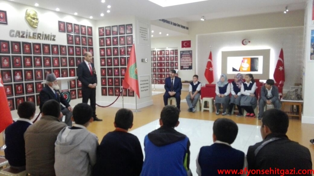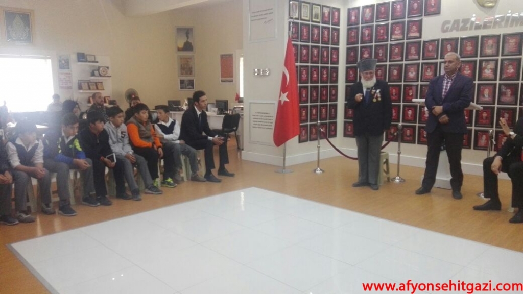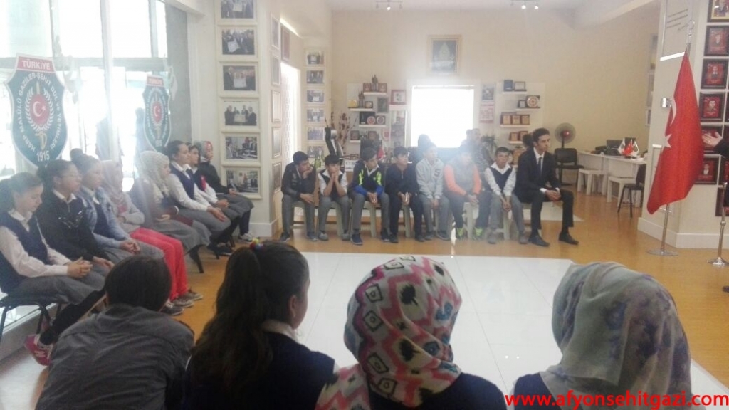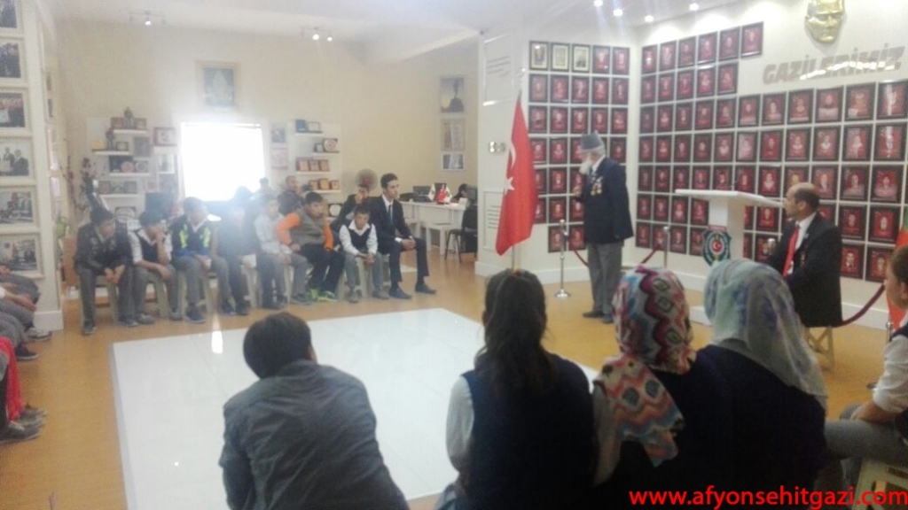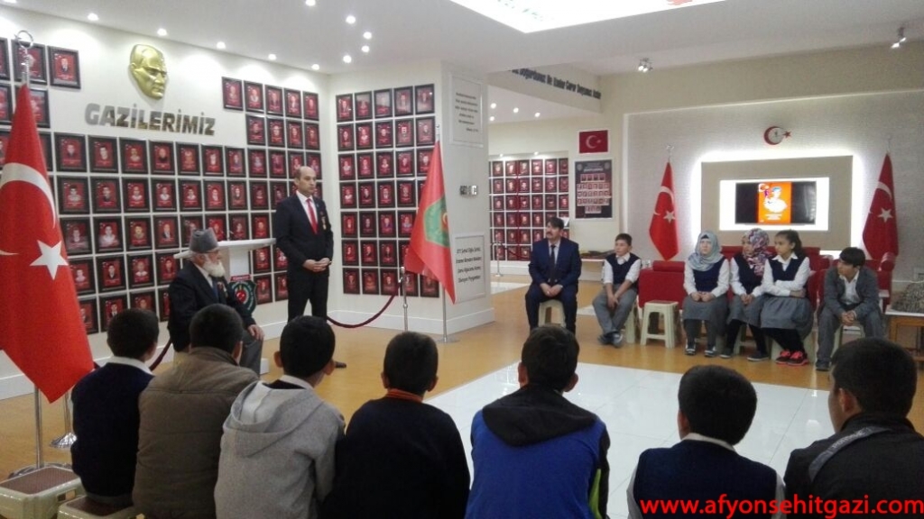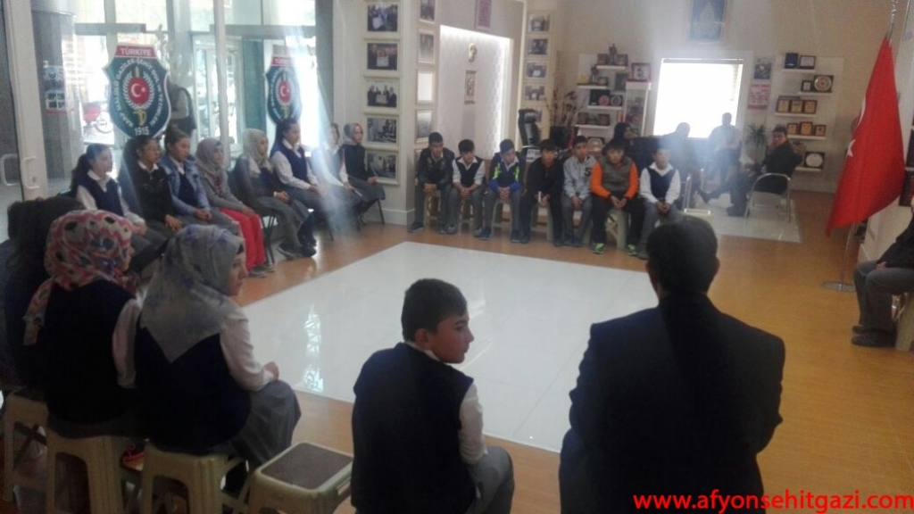 Ziyarette Dernek Başkanımız İsmail Kumartaşlı öğrencilere Afyonkarahisar Şehit ve Gazileri hakkında bilgiler verdikten sonra Şehitlik, Gazilik, Bayrak Sevgisi, Vatan sevgisi, Ülkemiz üzerinde oynana oyunlar ve bu oyunlara karşı koyabilmek için okumak gerektiğini anlattı. Terörle mücadelede sadece silahın çözüm olmadığını top yekün bir mücadele ile terörist ve yandaşlarına karşı konulması gerektiğini bunu yapabilmek için de kişinin bilgili olması gerektiği aslında en büyük silahın öğrencilerimizin ellerinde tuttukları kalam,kitap,defter olması gerektiğinin üzerinde defalarca durdu.Kıbrıs Gazisi Tahsin Koç öğrencilere savaş anılarını anlattıktan sonra ders çalışmalarını nasihat etti.