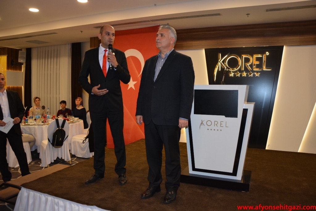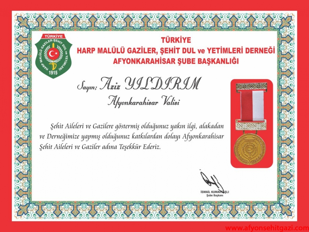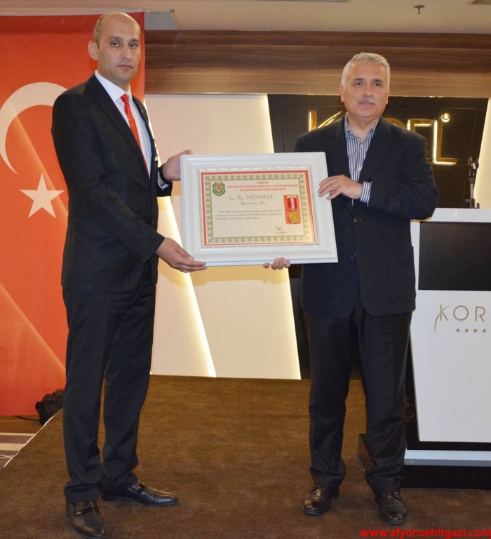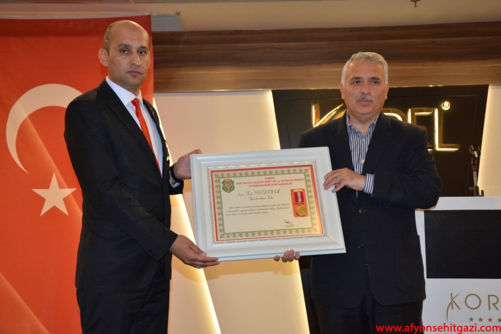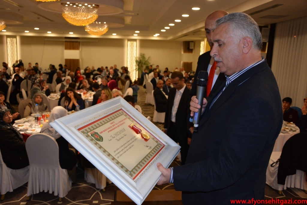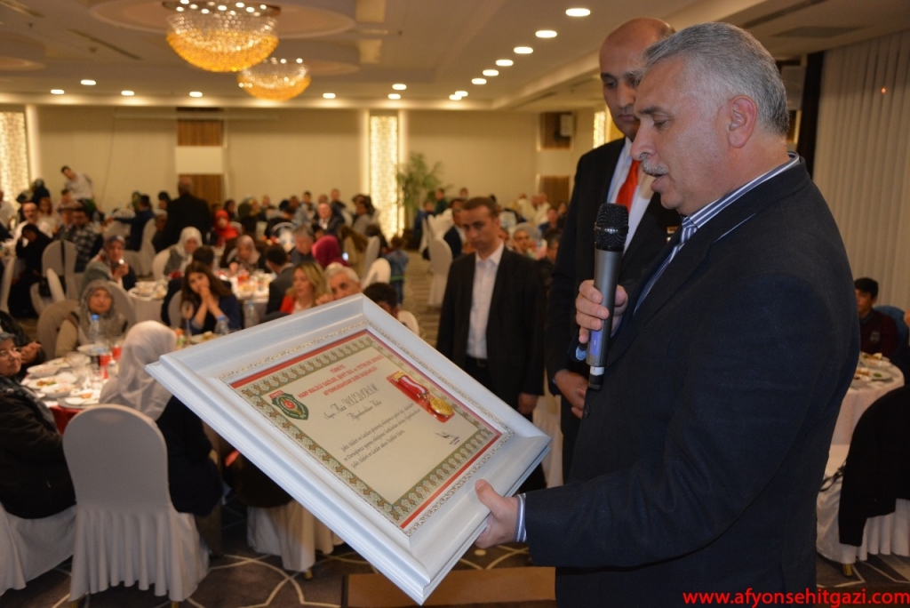 İftar programı sırasında konuşmalardan sonra,Türkiye Harp Malulü Gaziler Şehit Dul ve Yetimleri Derneği Afyonkarahisar Şube Başkanı İsmail Kumartaşlı vali Aziz YILDIRIM’a derneğin övünç adalyasını takdim ederek teşekkür etti.Kumartaşlı konuşmasında “Sayın valimiz geçen yıl 15 Haziran 2016 tarihinde saat 16.00 da Afyonkarahisar’a geldi ve akşam yine böyle bir otel ortamında saat 20.00 da ilk defa bizimle tanıştı ve iftar yaptı.Aradan bir yıl geçti zaman çok çabuk geçiyor bu bir yıl zaman içersinde 12 şehit haberi aldık beraber ağladık beraber dertlendik.Geçenyıldan bu güne aramıza 12 yeni üye katıldı.Duamız şudur ki birdaha şehit haberi almayalım.Sayımız artmasın.Bizler bu acıları yaşarken sayın valimiz devletin büyüklüğünü,sıcak yüzünü bizlere gösterdi hissettirdi.Bizlere bir abi,bir kardeş oldu.Kendisine kabul buyurursa derneğimizin madalyasını takdim etmek istiyoruz.”Dedi.