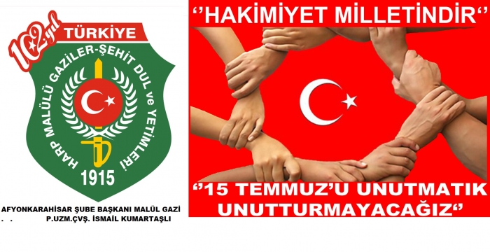 Türkiye Harp Malülü Gaziler, Şehit, Dul ve Yetimleri Dernek Başkanı İsmail Kumartaşlı, 15 Temmuz Şehitlerini Anma Demokrasi ve Milli Birlik Günü dolayısıyla bir mesaj yayınladı.