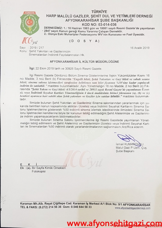 Türkiye Harp Malulü Gaziler Şehit Dul ve Yetimleri Derneği Afyonkarahisar Şube Başkanı İsmail Kumartaşlı 22 Ekim 2019 tarih ve 30926 Sayılı Resmi Gazete ile Şehit Aileleri ve Gazilere Sinemalarda % 50 İndirim sağlandığını duyurdu.