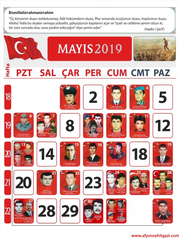 Afyonkarahisar Belediyesi’nin katkılarıyla Türkiye Harp Malulü Gaziler Şehit Dul ve Yetimleri Derneği Afyonkarahisar Şubesi tarafından hazırlanan "2019 Şehitler Takvimi" yayınlandı.