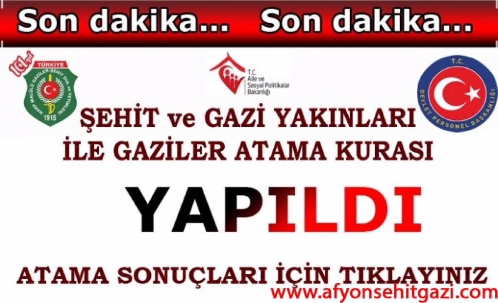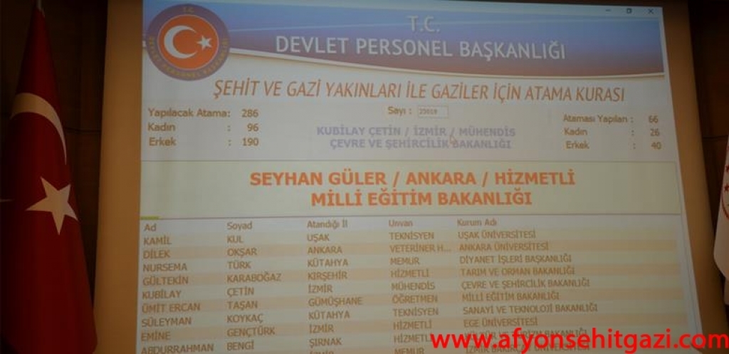 Aile, Çalışma ve Sosyal Hizmetler Bakanlığımızca hak sahibi olduğu tespit edilerek Devlet Personel Başkanlığı’na bildirilen (286) şehit yakını, gazi ve gazi yakınımızın atama kurası, Sayın Bakan Yardımcımız Ahmet KOCA Beyefendinin teşrifleriyle, Aile, Çalışma ve Sosyal Hizmetler Bakanlığı Reşat Moralı Salonunda noter huzurunda gerçekleştirildi. Söz konusu atama kurasına çok sayıda şehit yakını, gazi ve gazi yakınımız da iştirak etti.