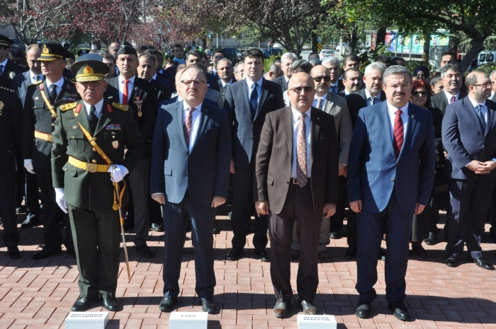 Vali Mustafa Tutulmaz, tören öncesi törene katılan kurum ve kuruluş temsilcileri ile öğrencilere hoş geldiniz diyerek, onları selamladı. Daha sonra Valilik çelengini Atatürk Anıtına sunan Vali Mustafa Tutulmaz’ın ardından Garnizon Komutanlığı çelengi Tuğg. Özdemir Şan ve Belediye Başkanlığı çelengi Burhanettin Çoban tarafından sunuldu.