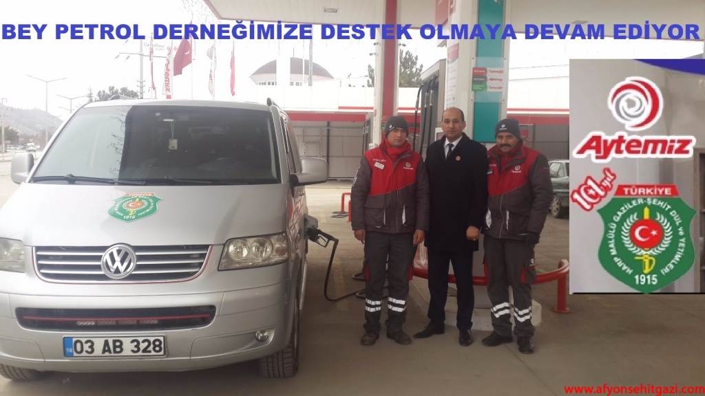 Konu ile ilgili açıklama yapan Türkiye Harp Malulü Gaziler, Şehit, Dul ve Yetimleri Derneği Afyonkarahisar Şubesi Başkanı İsmail Kumartaşlı“Afyonkarahisar’da hizmet veren Bey Petrolcülük, geçtiğimiz yıl Kasım ayından beri derneğimiz Türkiye Harp Malulü Gaziler, Şehit, Dul ve Yetimleri Derneği Afyonkarahisar Şubesi’nin hizmet aracına ayda bir kez mazot desteği vermeye başladı.Her ay düzenli olarak aracımızın mazot ihtiyacı olduğunda aracımıza mazot alıyoruz ve şahit ailelerimiz ve gazilerimizin hizmetinde kullanıyoruz.Bey Petrolcülük İstasyon Müdürü Mustafa Manav ve tüm yetkililere teşekkür ediyorum” dedi.