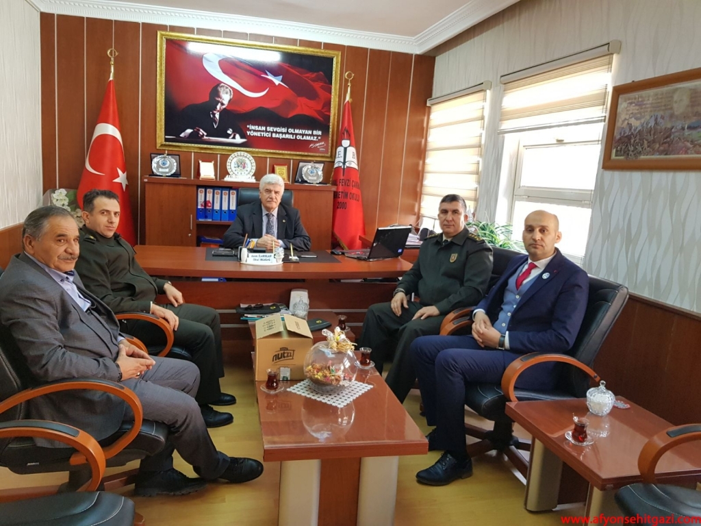 Türkiye Harp Malulü Gaziler, Şehitler Dul ve Yetimleri Derneği Afyonkarahisar Şube Başkanı Malul Gazi Piyade Uzman Çavuş İsmail Kumartaşlı, Afyonkarahisar Garnizon Komutanlığı Şehit Gazi İşlem Subayı Topçu Kıdemli Albay Fatih Sağdıç, Afyonkarahisar Merkez Komutanı Piyade Yüzbaşı Hanifi Savaş ve Dernek Başkan Yardımcısı Şemsettin Atacan’dan oluşan bir heyet, İlimizin en gözde okullarından olan Mareşal Fevzi Çakmak Okulu Müdürü Asım İlaslan’ı makamında ziyaret etti. İlaslan’a, Şehit, Gazi ve yakınlarına gösterdiği ilgi, alaka ve desteklerden ötürü teşekkür eden heyet, Eğitim üzerine İlaslan ile bir süre sohbet etti. İlaslan, “Yurdumuzun güvenliği, vatandaşlarımızın huzur için, vatan ve bayrak aşkıyla canlarını feda eden şehitlerimiz ve gazilerimizin hakkını ödememiz asla mümkün değildir” dedi. İlaslan , Albay Sağdıç ve Başkan Kumartaşlı’ya görevlerinde başarılar dileyerek, “Rabbim şuanda Afrinde hain örgütün inlerine giren kahraman mehmetçiğimizin yardımcısı olsun, ordumuzun yardımcısı olsun” dedi. Kendisini ziyaret eden heyete ziyaretlerinden dolayı teşekkür eden İlaslan, ziyaretten duyduğu memnuniyeti dile getirdi.Başkan Kumartaşlı ve Alb.Sağdıç Asım hocamıza teşekkür ederek 35 yıldır eğitim camiasına hizmet ediyorsunuz sizlerin yaptığı iş dah kutsal bu gün Afrinde ve ülkenin her köşesinde mücadele eden kahranam güvenlik güçlerini siz yetiştiriyorsunuz siz ilk okumayı öğretiyorsunuz dolayısıyla vatan savunması sizinle başlıyor.Dedi.