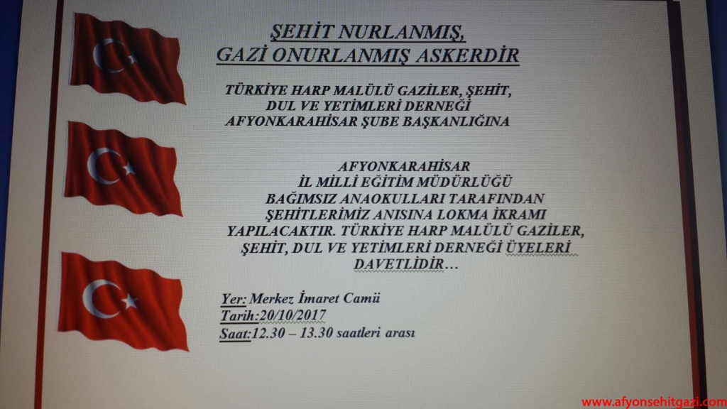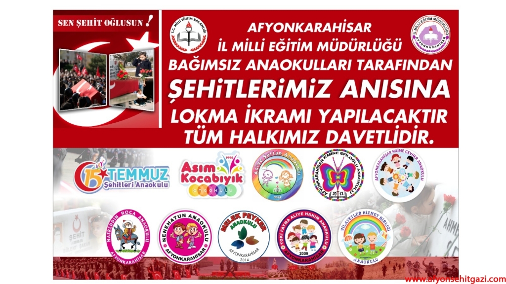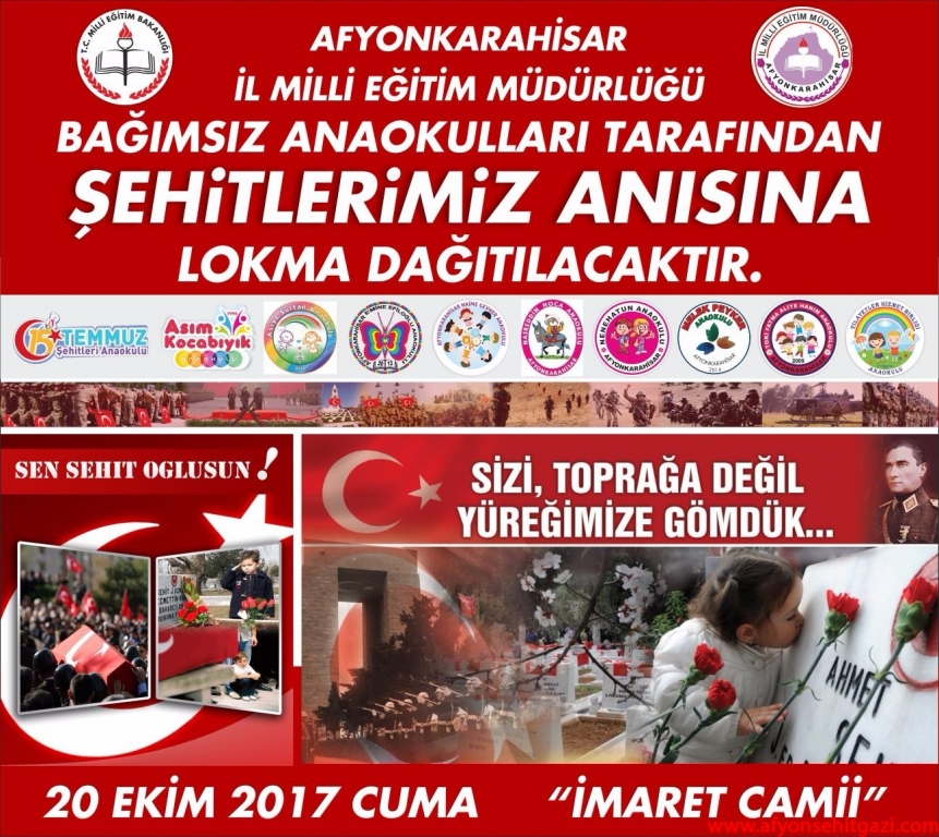 Afyonkarahisar İl Milli Eğitim Müdürlüğü Tarafından Yürütülmekte Olan Değerler Eğitimi Kapsamında Afyonkarahisar Merkezde Bulunan İl Milli Eğitim Müdürlüğü'ne Bağlı Bağımsız Anaokulu Tarafından Tüm Şehitlerimiz Anısına 20 Ekim 2017 Cuma Günü Cuma Namazından Sonra Lokma Dağıtımı ve İkindi Namazı Öncesinde Mevlüt Programı Yapılacaktır. Tüm Üyelerimiz Davetlidir.