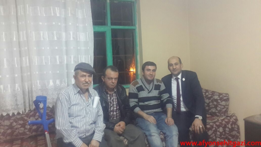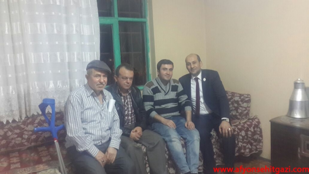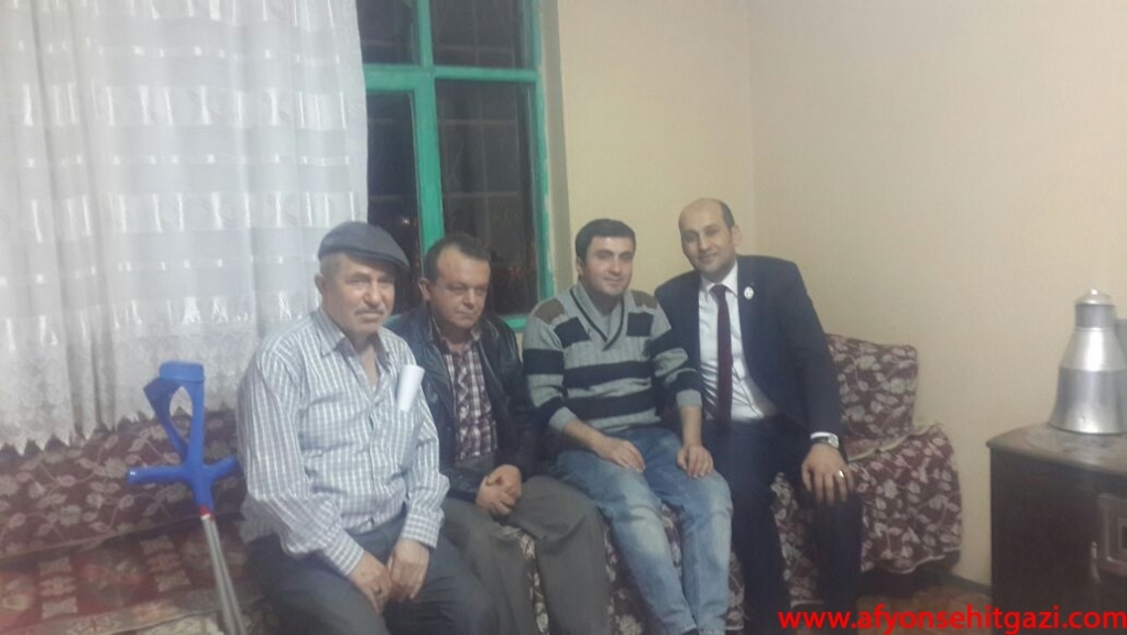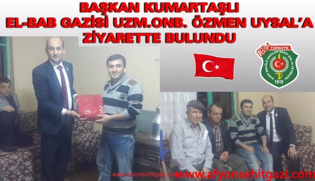 Derneğimiz Türkiye Harp Malülü Gaziler Şehit Dul ve Yetimleri Derneği Afyonkarahisar Şube Başkanı İsmail Kumartaşlı Gece gündüz demeden Şehit yakınları ve Gazilerimize hizmet etmeye devam ediyor.Siirt'ten Suriye El bab’a geçici görevle giden Dinarlı P.Uzm.Onb. Özmen Uysal 25 Ocak 2017 tarihinde El- Bab da DEAŞ terör örgütü saldırısı sonrası yaralandı.İlk müdahalesi yapıldıktan sonra Kilis'e getirilen gazimiz Piyade Uzman Onbaşı Özmen Uysal daha sonra Ankara GATA Hastanesi'nde tedavi altına alındı.Tedavisi sürecek olan Uysal istirahat alarak Afyonkarahisar Dinar ilçesi'ndeki Baba ocağına geldi. Baba ocağına gelen Uysal’ı Dernek Başkanımız İsmail Kumartaşlı ve Dernek temsilcimiz Hasan Ceylan ziyaret ederek sağlık durumu hakkında bilgi aldı. Gazimizin ayaklarından yaralandığını ve ciddi bir duyma kaybı olduğunu söyleyen Kumartaşlı gazimizin ailesine ve gazimize geçmiş olsun diyerek herzaman yanlarında olacaklarını bildirerek acil şifalar diledi.