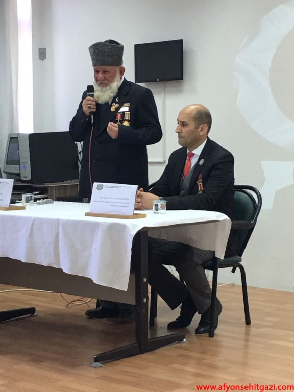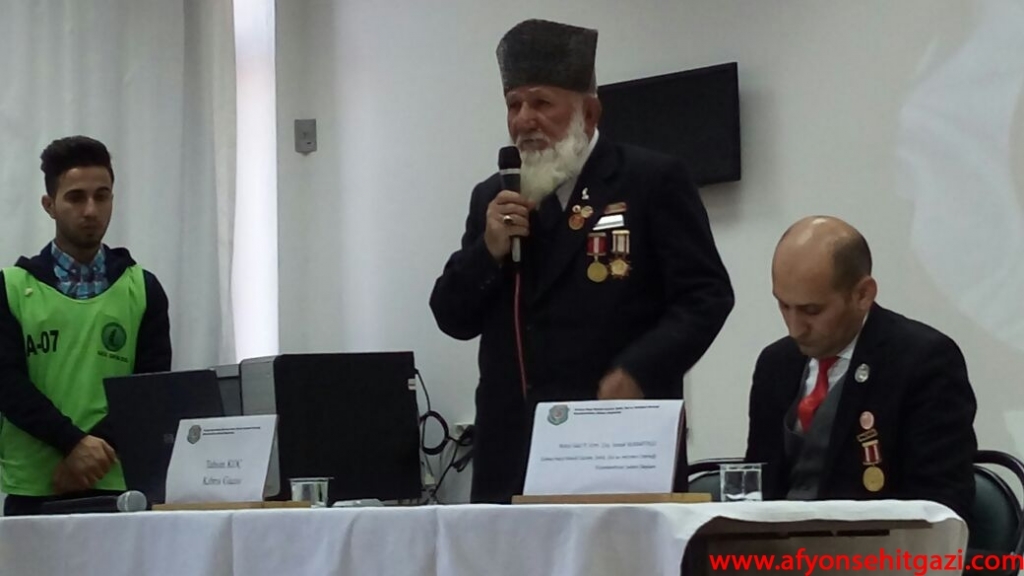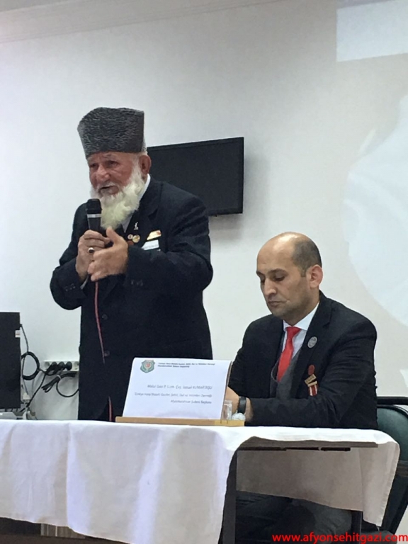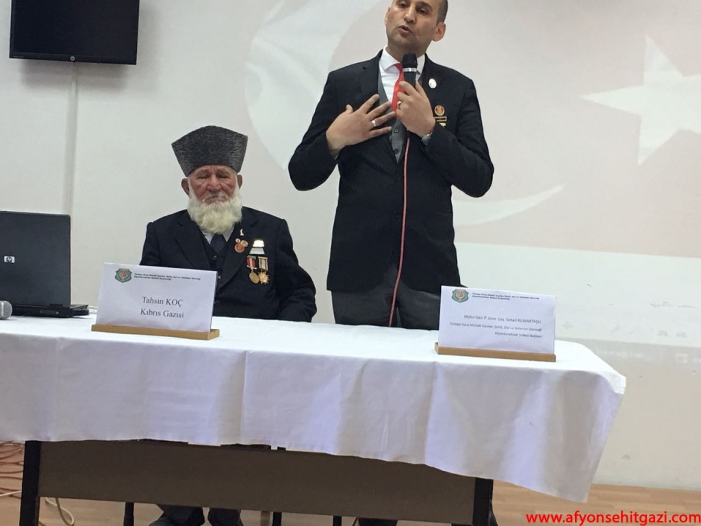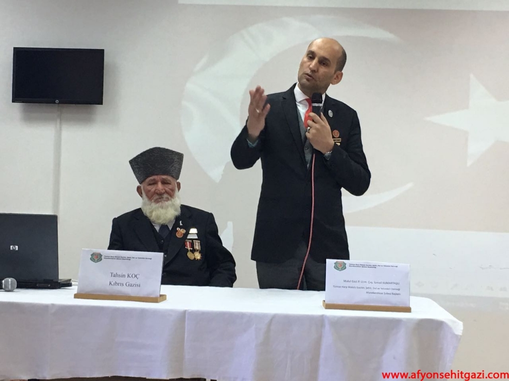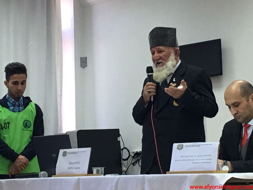 Türkiye Harp Malulü Gaziler, Şehit, Dul ve Yetimleri Derneği Afyonkarahisar Şubesi Başkanı Malul Gazi P. Uzm. Çvş. İsmail KUMARTAŞLI kendisini tanıtarak yaptığı konuşmasında; Başından geçen gazilik anılarını, fiziksel ve psikolojik etkilenmelerini ve kendisinde bıraktığı izleri paylaştı. 101. yılını kutladıkları Dernek’lerini tanıtarak tarihsel gelişimi üzerinden bu günkü durumu ile ilgili bilgiler verdi. Şehitlik payesine ulaşanlarla ilgili Dernek olarak cenaze ve taziye esnasında yapılanları anlatarak, bir tek çakıl taşını dahi düşmanlara vermeyip, gerekirse yine savaşa gidip vatan için canını feda edebileceğini, terör örgütlerine yataklık edenlerin geçmişte de olduğunu ve asla yılmayacaklarını, PKK terör örgütünün nasıl gelişim gösterdiği ve ülkemize ne tür zararlar verdiği üzerine bilgilendirmeler yaptı.