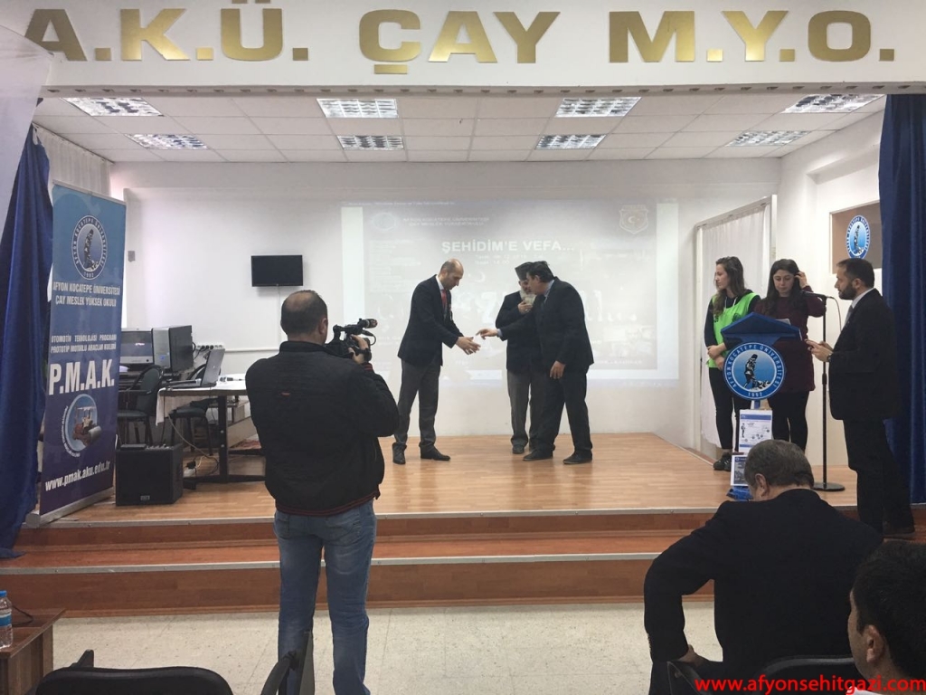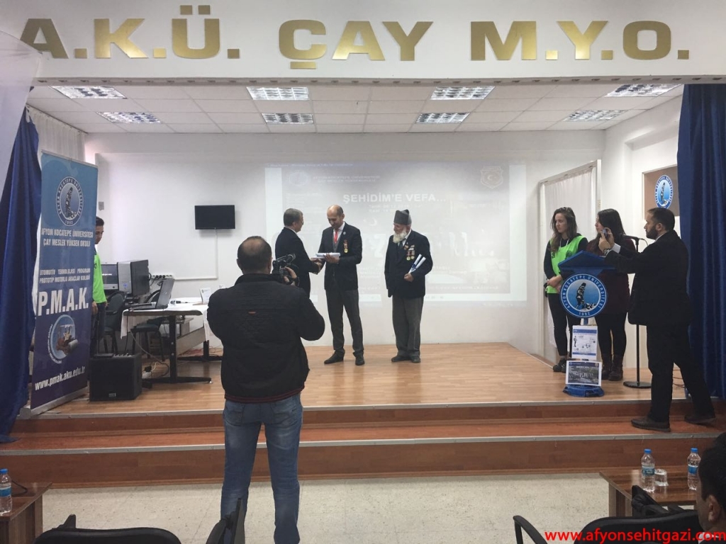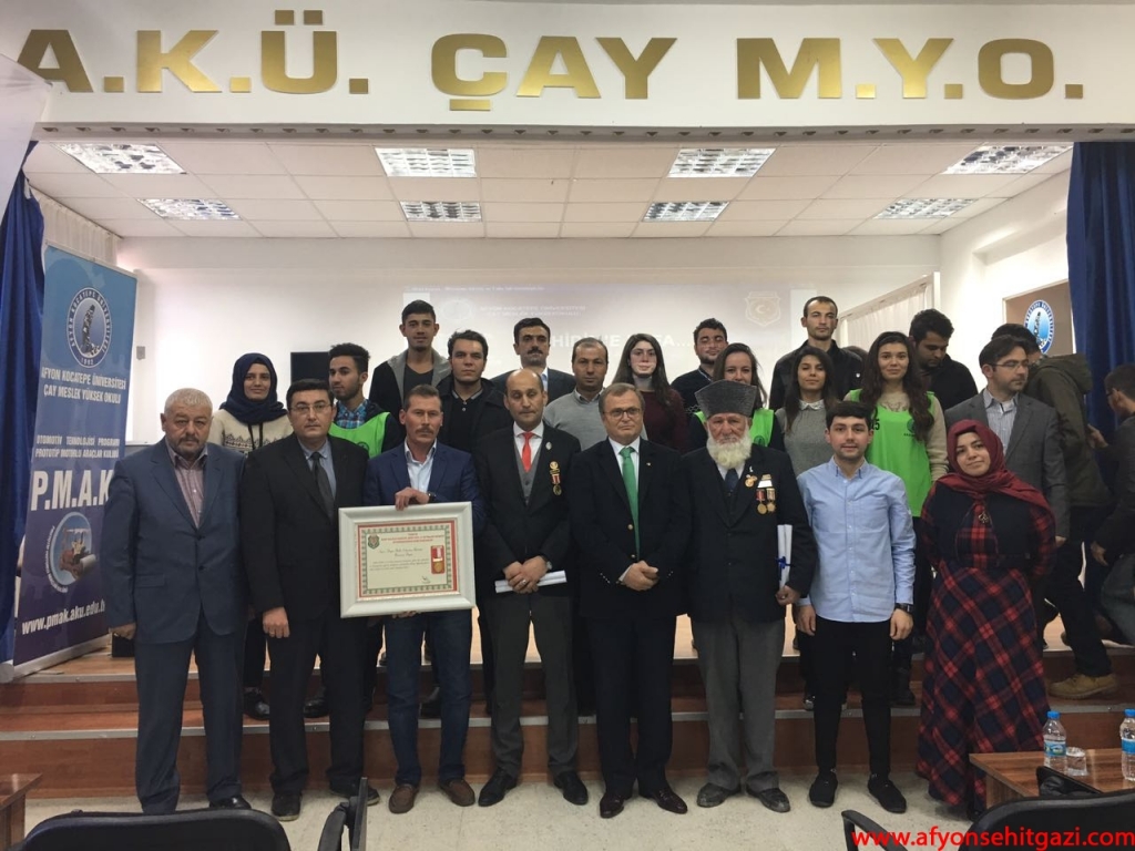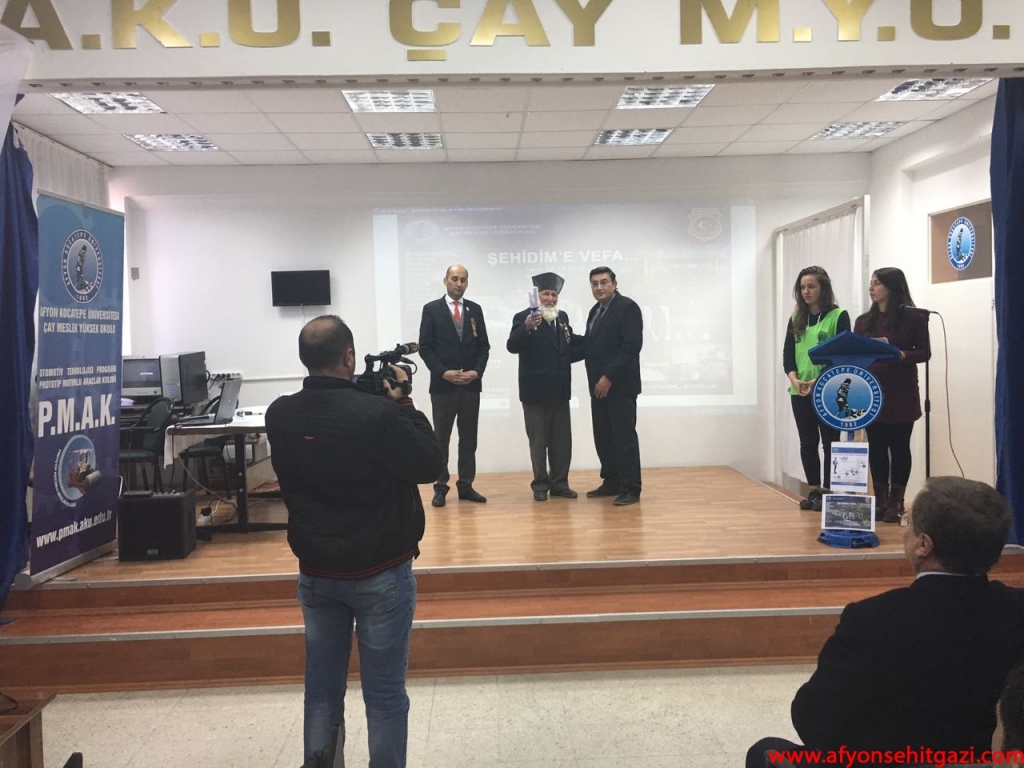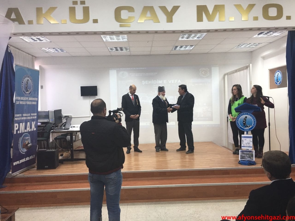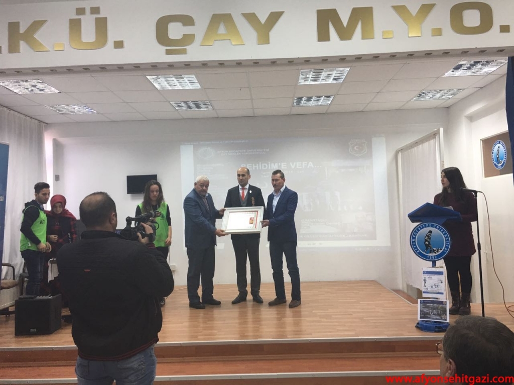 Etkinlik sonrasında Şehit Aileleri’ne yönelik göstermiş olduğu duyarlılık gereği İlçe’miz dahilinde düzenlediği kampanyası nedeni ile İlçe’miz işletmecilerinden Ramazan DOĞAN’a Türkiye Harp Malulü Gaziler, Şehit, Dul ve Yetimleri Derneği Afyonkarahisar Şubesi Başkanı Malul Gazi P. Uzm. Çvş. İsmail KUMARTAŞLI tarafından teşekkür plaketi takdimi ve devamında katılımları nedeni ile Kıbrıs Gazisi Tahsin KOÇ’a Meslek Yüksekokulu’muz Müdür Yardımcısı Öğr. Gör. Hasan ORUNCAK tarafından Organizasyon afişi ve teşekkür yazısı takdimi, Türkiye Harp Malulü Gaziler, Şehit, Dul ve Yetimleri Derneği Afyonkarahisar Şubesi Başkanı Malul Gazi P. Uzm. Çvş. İsmail KUMARTAŞLI’ya Çay Ticaret ve Sanayi Odası Yönetim Kurulu Başkanı’mız Salih KAYGISIZ tarafından Organizasyon afişi ve teşekkür yazısı takdimlerinin sonrasında günün anısına hatıra resimleri çekimleri ile nihayetlendirilmiştir.