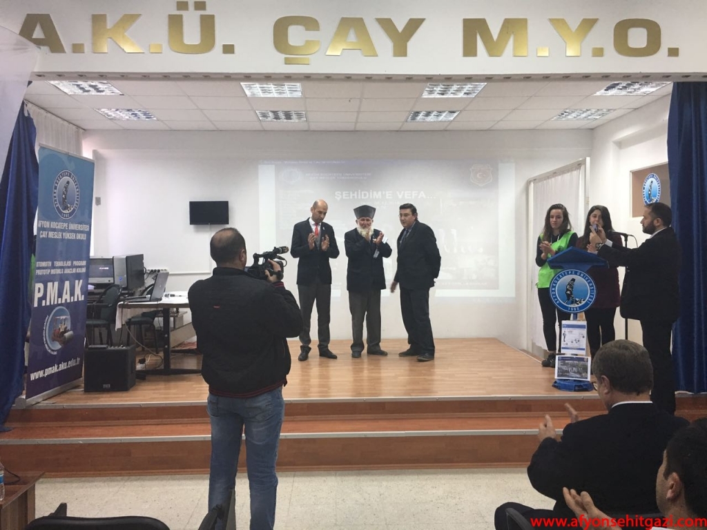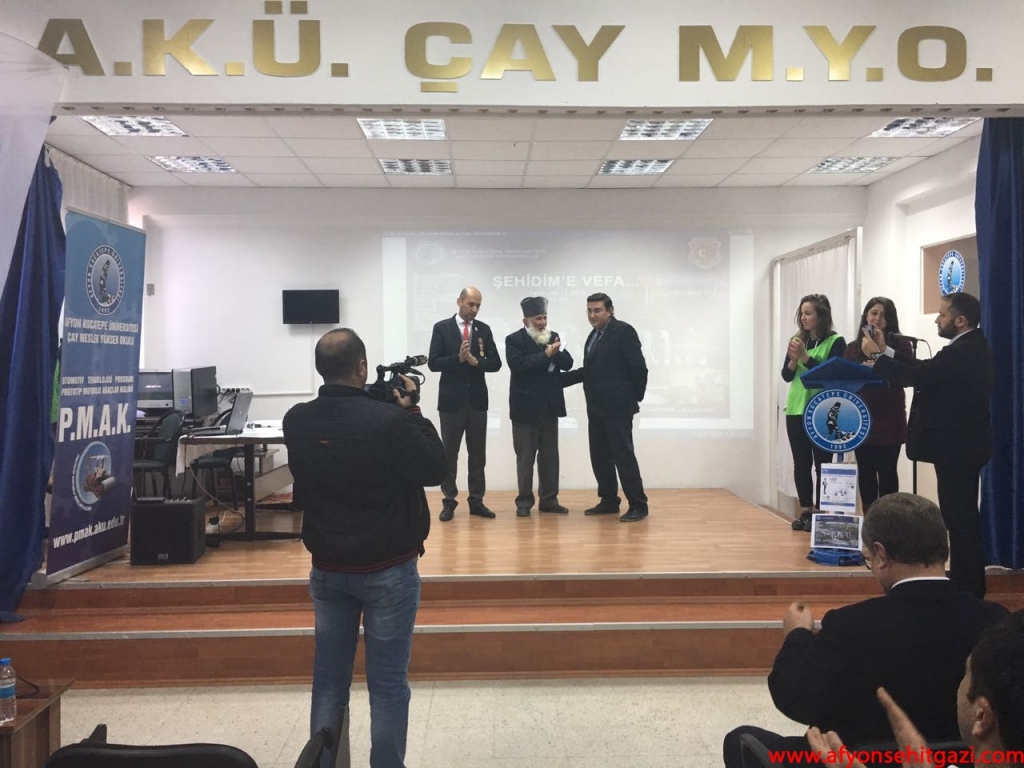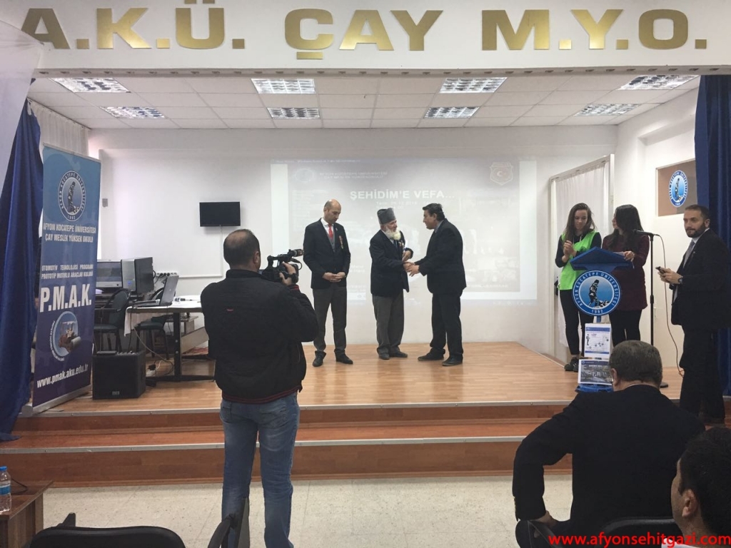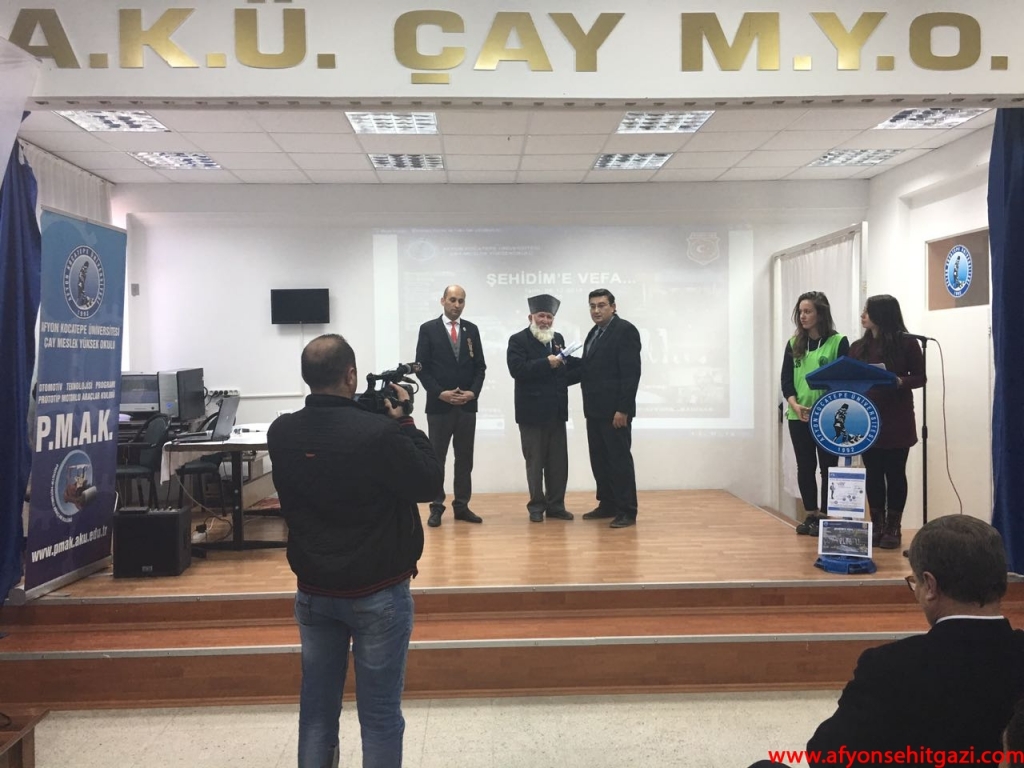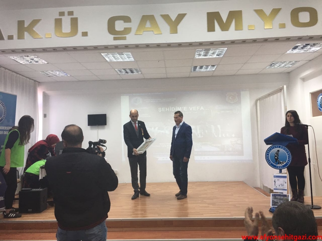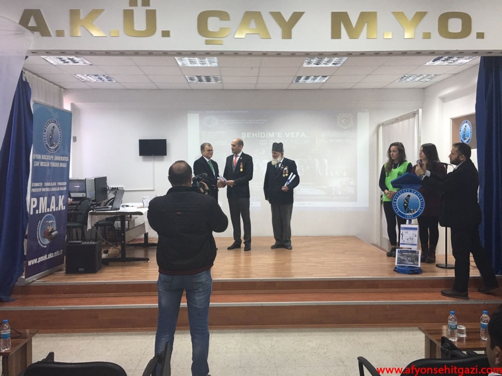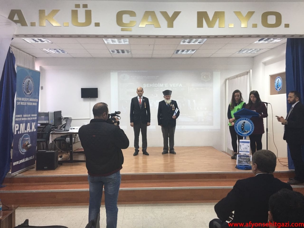 Etkinlik sonrasında Şehit Aileleri’ne yönelik göstermiş olduğu duyarlılık gereği İlçe’miz dahilinde düzenlediği kampanyası nedeni ile İlçe’miz işletmecilerinden Ramazan DOĞAN’a Türkiye Harp Malulü Gaziler, Şehit, Dul ve Yetimleri Derneği Afyonkarahisar Şubesi Başkanı Malul Gazi P. Uzm. Çvş. İsmail KUMARTAŞLI tarafından teşekkür plaketi takdimi ve devamında katılımları nedeni ile Kıbrıs Gazisi Tahsin KOÇ’a Meslek Yüksekokulu’muz Müdür Yardımcısı Öğr. Gör. Hasan ORUNCAK tarafından Organizasyon afişi ve teşekkür yazısı takdimi, Türkiye Harp Malulü Gaziler, Şehit, Dul ve Yetimleri Derneği Afyonkarahisar Şubesi Başkanı Malul Gazi P. Uzm. Çvş. İsmail KUMARTAŞLI’ya Çay Ticaret ve Sanayi Odası Yönetim Kurulu Başkanı’mız Salih KAYGISIZ tarafından Organizasyon afişi ve teşekkür yazısı takdimlerinin sonrasında günün anısına hatıra resimleri çekimleri ile nihayetlendirilmiştir.