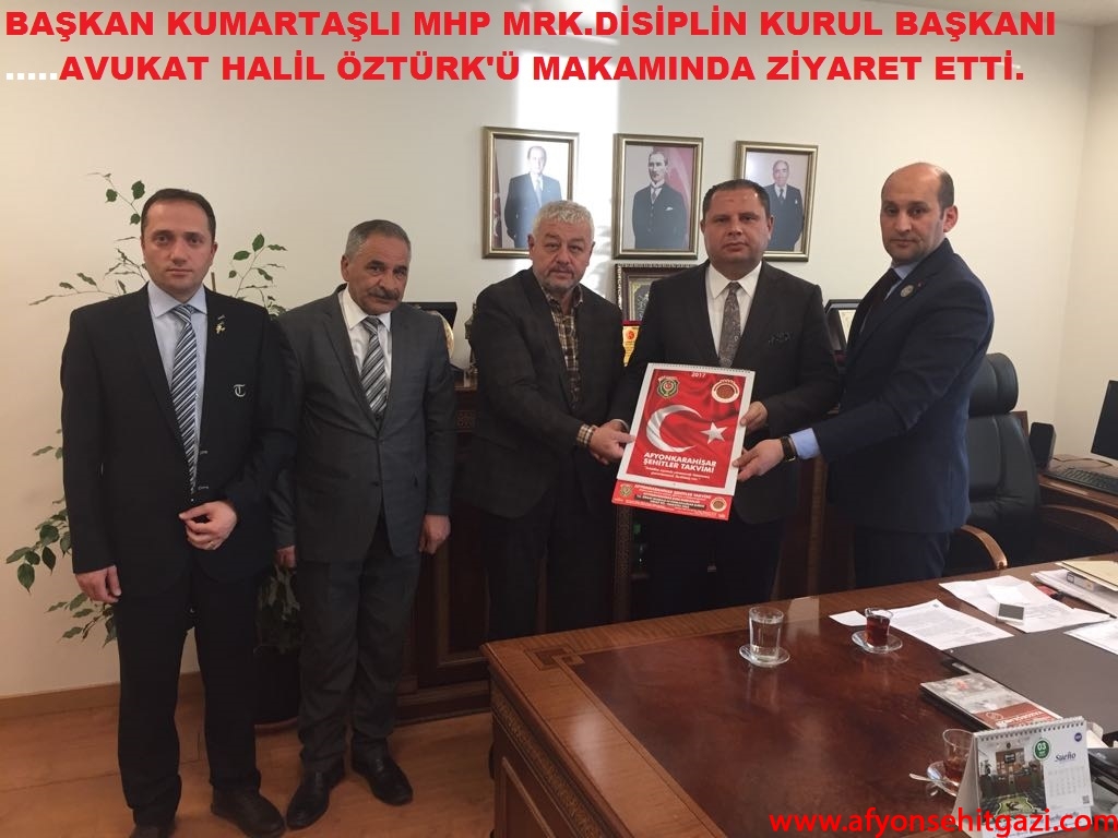 Türkiye Harp Malulü Gaziler, Şehit Dul ve Yetimleri Derneği Afyonkarahisar Şube Başkanı İsmail Kumartaşlı ve yönetim kurulu Ankarada MHP Genel Merkezinde MHP Merkez Disiplin Kurulu Başkanı Av.Halil ÖZTÜRK ü ziyaret etti.