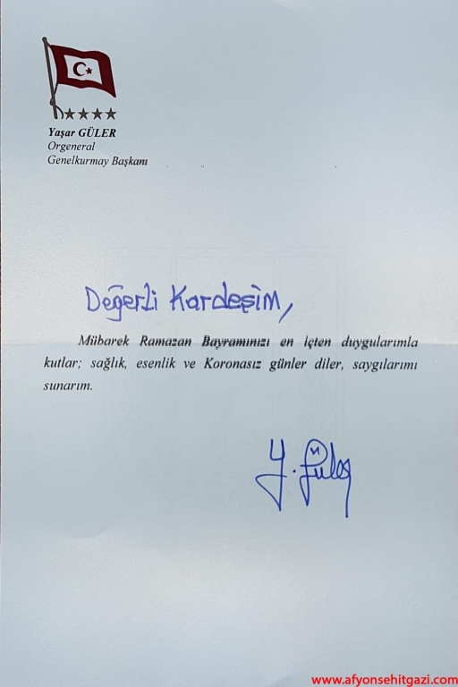 Türkiye Harp Malulü Gaziler Şehit Dul ve Yetimleri Derneği Afyonkarahisar Şube Başkanı Malul Gazi İsmail Kumartaşlı Ramazan Bayramında Komutanlarımızın Bayramını Kutlayarak Bayram Tebriği Göndermişti.