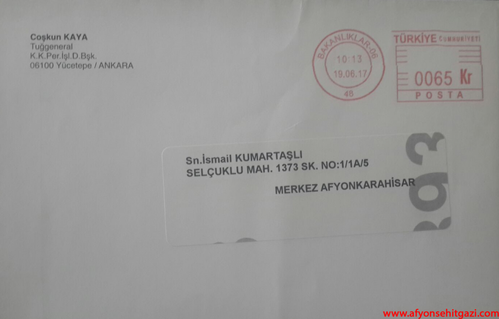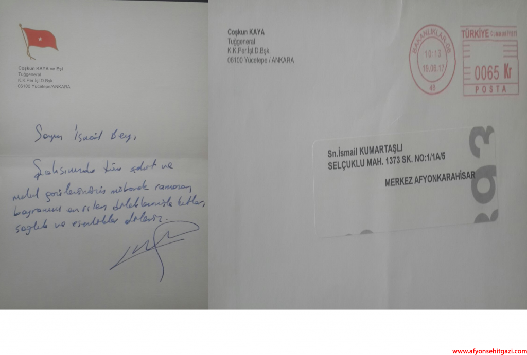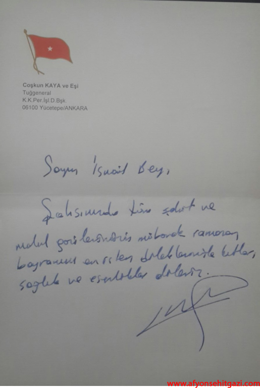 Türkiye Harp Malülü Gaziler Şehit Dul Ve Yetimleri Derneği Afyonkarahisar Şube Başkanı Malül Gazi İsmail Kumartaşlı Ramazan Bayramında Komutanlarımızın Bayramını Kutlayarak Bayram Tebriği Göndermişti