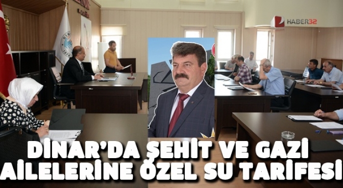 Gazi ve Şehit Ailelerine Özel Su Tarifesi Uygulaması Başladı Dinar Belediye Başkanı Nihat Sarı’nın seçim beyannamesinde belirtmiş olduğu Gazi ve Şehit Ailelerine indirimli su tarifesi uygulaması başladı. Dinar Belediye Başkan Vekili Veli Özcan başkanlığında toplanan Haziran Ayı Meclis toplantısında gündem maddesi olarak sunulan Gazi ve Şehit ailelerine indirimli su tarifesi hayata geçti. 2019 yılı Haziran ayından itibaren geçerli olacak tarife ile mevzuat gereği ücretsiz yapılamadığından dolayı sembolik olarak suyun tonu gazi ve şehit ailelerine 0.01 kuruş olarak belirlendi. Dinar Belediye Başkanı Nihat Sarı konuyla ilgili yaptığı açıklamasında; “Seçim beyannamemizde belirtmiş olduğumuz sözlerimizi birer-birer yerine getiriyoruz. Gazi ve Şehit ailelerimize seçim döneminde söz vermiş olduğumuz su tarifemizi Haziran ayı itibari ile hayata geçirdik. Her zaman Gazilerimizin, Şehit ailelerimizin yanında olduk. Allah’ın izni ile bundan sonra sonrada onların yanında olmaya devam edeceğiz’ diye konuştu.