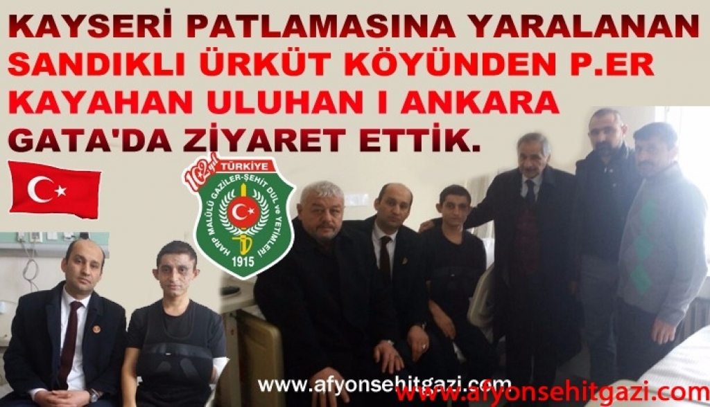 17-12-2016 tarihinde Kayseride teröristlerin patlayıcı yüklü araç ile yaptıkları saldırıda Afyonkarahisardan P.Er Kamil Tunç şehit olmuş 2 Afyonlu askerimizde yaralanmıştı.Derneğimiz Türkiye Harp Malülü Gaziler Şehit Dul ve Yetimleri Derneği Afyonkarahisar Şube Başkanı İsmail Kumartaşlı ve yönetim kurulu üyeleri GATA da tedavi gören P.Er Kayahan Uluhan'ı ziyaret etti.Moral durumunun iyi olduğunu gördüğümüz gazimiz inşaallah tedavilerini sonrasında sağlığına kavuşarak aramıza dönecek diyen başkan Kumartaşlı gazimizin ailesi ne geçmiş olsun dileklerini ileterek her zaman arayabilirsiniz bir ihtiyacınız olduğunda hep yanınızdayız.dedi.
