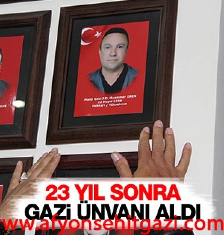 Hakkari'nin Yüksekova ilçesinde 23 Mayıs 1994'te mayın patlaması sonucu yaralanan Muammer Eren'e 23 yıl sonra aynı gün "Gazilik" unvanı verildiTürkiye Harp Malulü Gaziler Şehit Dul ve Yetimleri Derneği Afyonkarahisar Şube Başkanı Kumartaşlı:"Ne tesadüftür ki 23 Mayıs 1994'te yaralandı, 23 Mayıs 2017'de 23 yıl sonra gazilik aylığını aldı. Devletimiz tarafından 'malul gazi' olarak, terör gazisi olarak onurlandırıldı. Bizim için de gazimiz için de büyük mutluluk"Gazi Eren:"Gazilik benim için çok şerefli bir duygu. Tüylerim diken diken oluyor. Gerekirse vatanım için her şeyi yaparım, şu vaziyette yine giderim. Canımızı veririz bu vatan için"