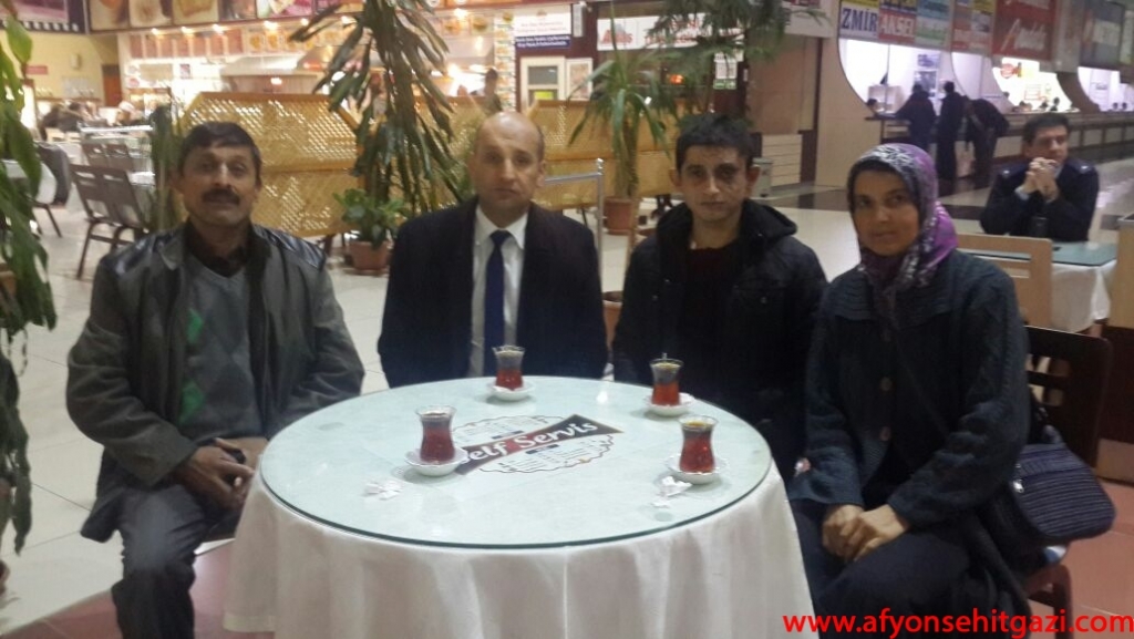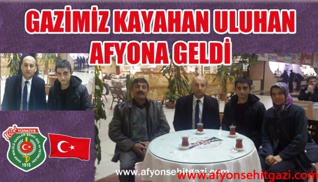 GATA'da tedavisi süren gazimiz bugün afyona hava değişimi alarak geldi.Derneğimiz Türkiye Harp Malülü Gaziler Şehit Dul ve Yetimleri Derneği Afyonkarahisar Şube Başkanı İsmail Kumartaşlı ve Afyonkarahisar İkmal ve Garnizon Komutanı Tuğgeneral Şahin Kılıçaslan’ın emri ile askeri yetkililer P.Er Kayahan Uluhan'ı ve ailesini karşıladı. Yoğun kar yağışı nedeniyle Sandıklı yolunun kapanmasından dolayı Afyonkarahisar İkmal ve Garnizon Komutanı Tuğgeneral Şahin Kılıçaslan’ın emri ile Gazimiz ve ailesi Afyonkarahisar Ordu evinde misafir edilmek üzere ordu evine getirildi. Yarınki hava durumuna göre Gazimiz ve ailesi askeri yetkililer tarafından Sandıklı’ya götürülecek.