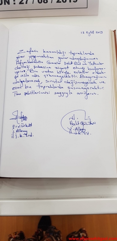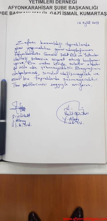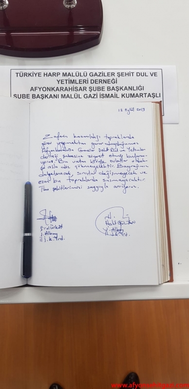 Albaylar ziyaret sırasında dernekte bulunan Şehit Aileleri ve Gaziler ile de bir süre sohbet ettikten sonra, ziyaret defterine duygularını yazdılar.