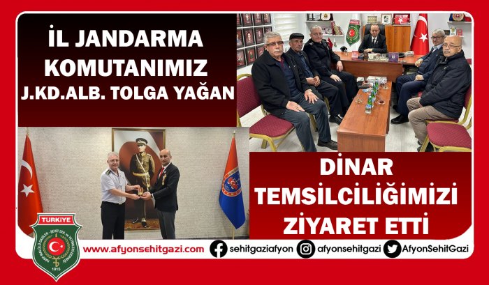 Her fırsatta Şehit aileleri ve gazilerle buluşan Komutan Yağan’a teşekkür eden Başkan İsmail Kumartaşlı; “ Göreve geldiği günden bu güne derneğimiz Afyonkarahisar Şube Başkanlığı ve temsilciliklerini hiç yalnız bırakmayan, her fırsatta ziyaret ederek, destekçi olduğunu belirten, derneğimiz ve camiamız ile yakından ilgilenen değerli komutanımız Afyonkarahisar İl Jandarma Komutanı J.Kd.Alb.Tolga Yağan derneğimiz Afyonkarahisar şube başkanlığına bağlı hizmet veren Dinar temsilciliğini ziyaret etti. Değerli Komutanımız J.Kd.Alb.Tolga Yağan'a bu güne kadar bizlere gösterdiği yakın ilgi ve alakadan dolayı camiamız adına teşekkür ederim”dedi.