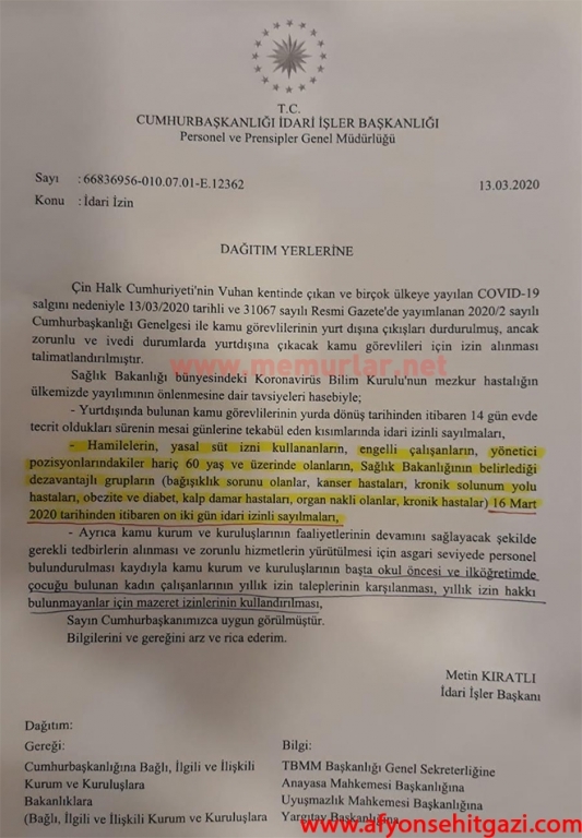 Yayımlanan Genelgeye göre, hamileler, yasal süt izni kullananlar, engelli çalışanlar, yöneticiler hariç 60 yaş ve üzerinde olanlar, kronik hastalığı olanlar 16 Mart 2020'den itibaren 12 gün idari izinli sayılacak.
