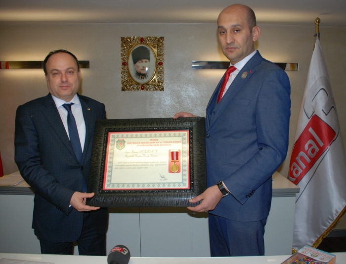 Türkiye Harp Malulü Gaziler, Şehit, Dul ve Yetimleri Derneği Afyonkarahisar Şube Başkanı İsmail Kumartaşlı, şehit aileleri ve gazilere verdiği desteklerden dolayı Megabirlik Medya Yönetim Kurulu Başkanı Hüsnü Serteser’e plaket takdim etti.