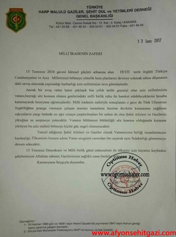 Türkiye Harp Malulü Gaziler, Şehit Dul ve Yetimleri Derneği Genel Başkanı J Alb. Taner Uran ve yönetiminin 15 Temmuz Şehitlerini Anma Demokrasi Ve Milli Birlik Günü Mesajını yayımlıyoruz.