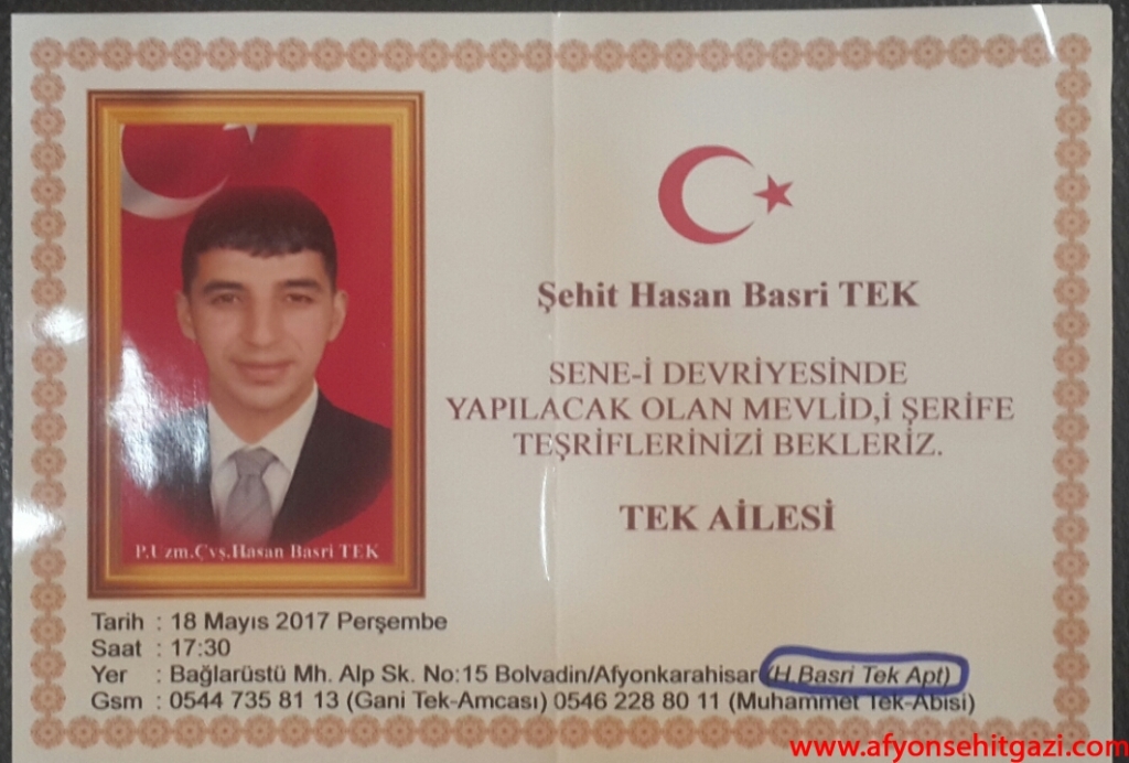 19 Mayıs 2016 tarihinde Mardin Nusaybinde teröristler ile girdiği silahlı çatışma sonucunda şehit olan Şehit P.Uzm.Çvş.Hasan Basri TEK’in sene-i Devriyesinde Yapılacak Olan Mevlid-i Şerife Tüm Halkımız Davetlidir.