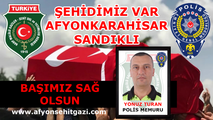 Şehidimize Allah'tan Rahmet Kederli Ailesine,İlimize ve Ülkemize Başsağlığı Dileriz. Şehidimiz Yonuz TURAN'ın Cenaze Töreni Yarın Öğlen Namazına Müteakip Sandıklı İlçesi Alacamii Köyü'nde Olacaktır. Başımız Sağolsun.