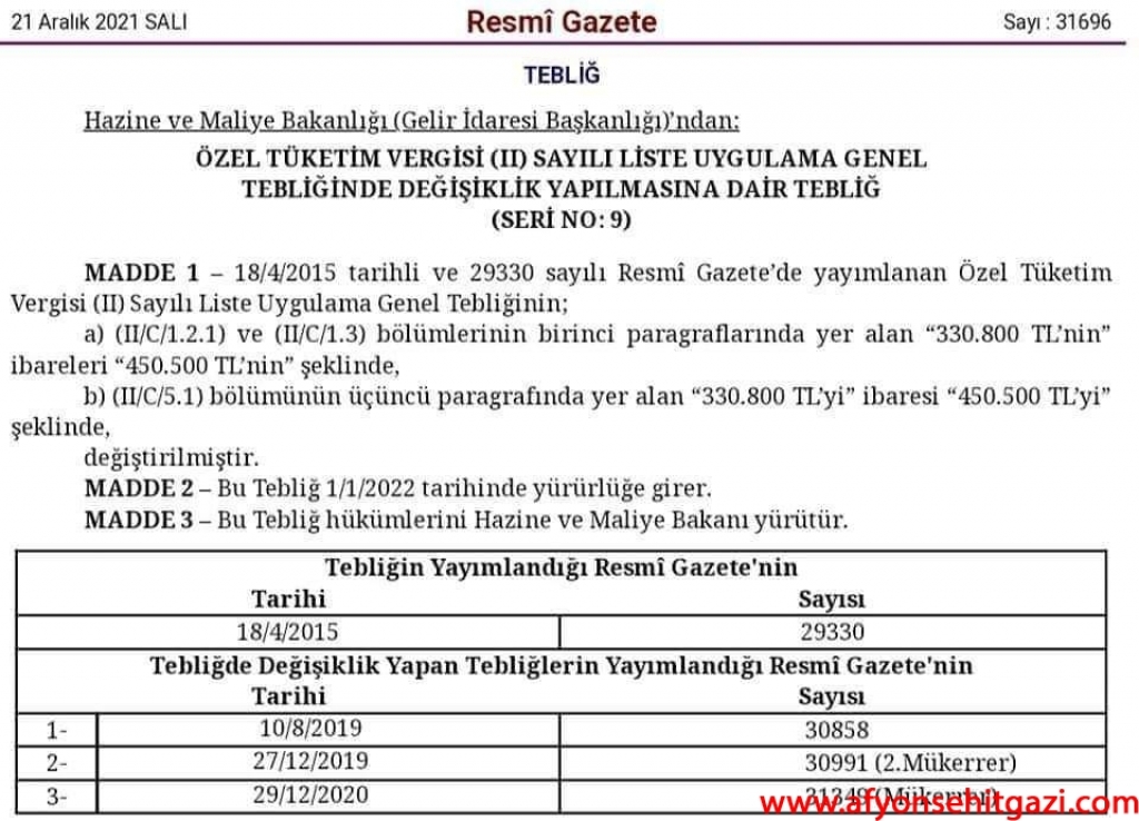 Resmi Gazete'de yayımlanan tebliğe göre; ÖTV indirimli engelli araç alımlarında uygulanan matrah, 330 bin 800 liradan 450 bin 500 liraya yükseltildi. 1 Ocak 2022 tarihi itibariyle yürürlüğe girecek yeniden değerleme oranı yüzde 36 oldu.