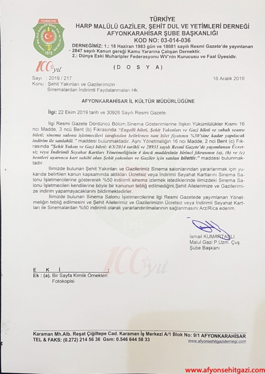 Türkiye Harp Malulü Gaziler Şehit Dul ve Yetimleri Derneği Afyonkarahisar Şube Başkanı İsmail Kumartaşlı 22 Ekim 2019 tarih ve 30926 Sayılı Resmi Gazete ile Şehit Aileleri ve Gazilere Sinemalarda % 50 İndirim sağlandığını duyurdu.