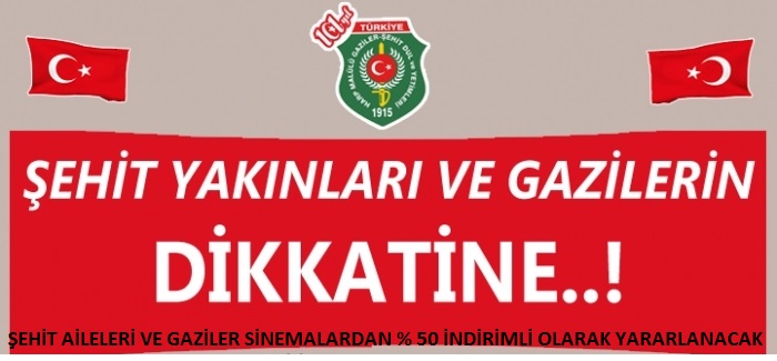 ŞEHİT AİLELERİ VE GAZİLERE SİNEMALARDA % 50 İNDİRİM