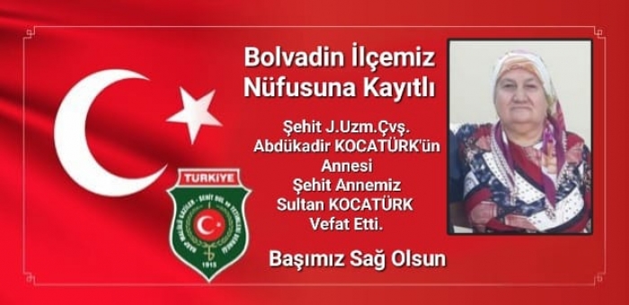 14.04.2001 Tarihinde Bingöl Genç Kırsalında Şehit Olan Bolvadin İlçemiz Nüfusuna Kayıtlı Şehidimiz, Şehit J.Uzm.Çvş. Abdülkadir KOCATÜRK'ün Annesi Sultan KOCATÜRK (10.06.1956 Doğumlu)Tedevi Gördüğü Afyonkarahisar Devlet Hastanesinde Vefat Etmiştir. Cenazesi 01.07.2024 Pazartesi Öğle Namazına Müteakip Bolvadin Müslümana Camiinde Kılınacak Namaz Sonrasında Son Yolculuğuna Uğurlanacaktır. Başımız Sağ Olsun.