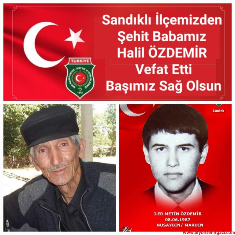 08.06.1987 Tarihinde Mardin Nusaybin'de Şehit Olan Sandıklı İlçemiz Nüfusuna Kayıtlı Şehidimiz, Şehit J.Er Metin ÖZDEMIR'in Babası Değerli Şehit Babamız Halil ÖZDEMİR (1943 Doğumlu) Bu Gün Vefat Etmiştir. 22.04.2023 Cumartesi Öğle Namazına Müteakip Sandıklı Selçik Köyünden Son Yolculuğuna Uğurlanacaktır.