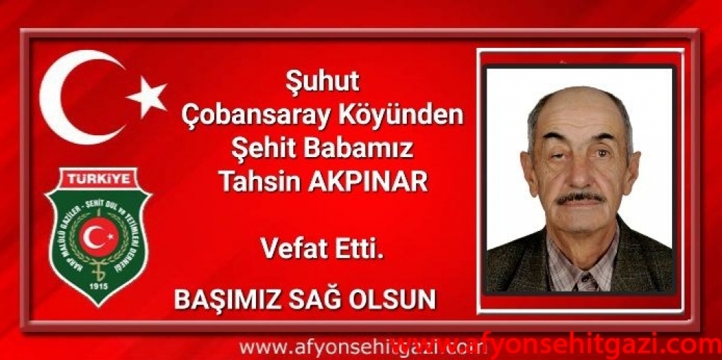 Şuhut Çobankaya Köyünden 03.10.1993 Tarihinde Bingöl'de Çatışma Sonucu Şehit Olan, Şehit P.Er Mesut AKPINAR'ın Babası Tahsin AKPINAR (05.01.1949 Doğumlu) Bu Gün İzmir'de Tedavi Gördüğü Hastanede Vefat Etmiştir.
