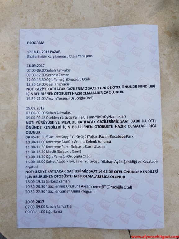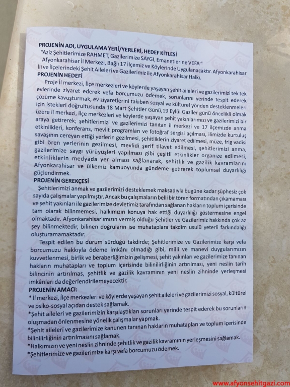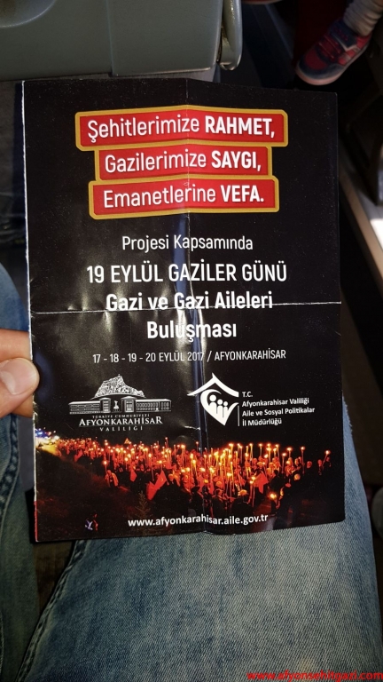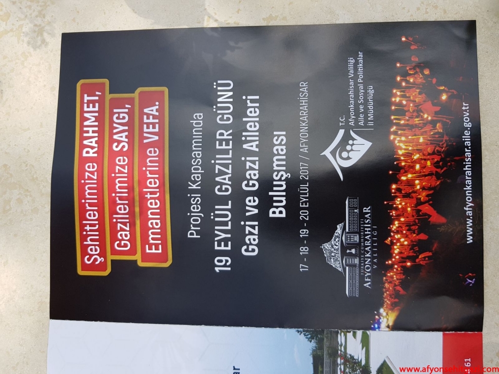 Aile ve Sosyal Politikalar Afyonkarahisar Müdürlüğü'nün "Şehitlerimize Rahmet Gazilerimize Saygı ve Emanetlere Vefa" projesi kapsamında kente gelen yaklaşık 650 gazi ve şehit yakını 5 yıldızlı bir otelde 4 gün boyunca misafir edildi proje kapsamında gazilerimize tatil tadında bir program hazırlayan Aile ve Sosyal Politikalar Afyonkarahisar Müdürlüğü yetkilileri proje kapsamında gezi programları da düzenledi. ilk olarak binlerce yıllık geçmişi olan ve son yılllarda tanıtımına çok önem verilen Frig Vadisi gezisi düzenlendi.14 otobüs ile gazilerin ve ailelerinin yoğun katılım sağladığı gezi de Frik Vadisi mağraları,Döğer Kervansarayı ve son olarak Karacaahmet Trübesine ziyaret ederek dua edildi ve otele dönüş yapıldı.Programın 2 nci gününde ise Gazilerimiz ve aileleri Şuhut Atatürk evi,Kocatepe ve tarihi yerleri Rehber,Öğretmen,Alankılavuzu,Araştırmacı yazar Habip AKALIN tarafından duygusal bir anlatım ile dolaşma imkanı buldu.