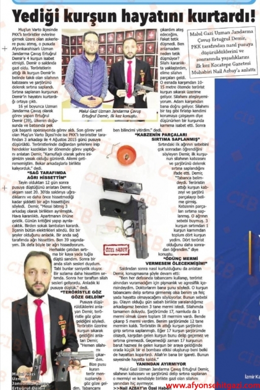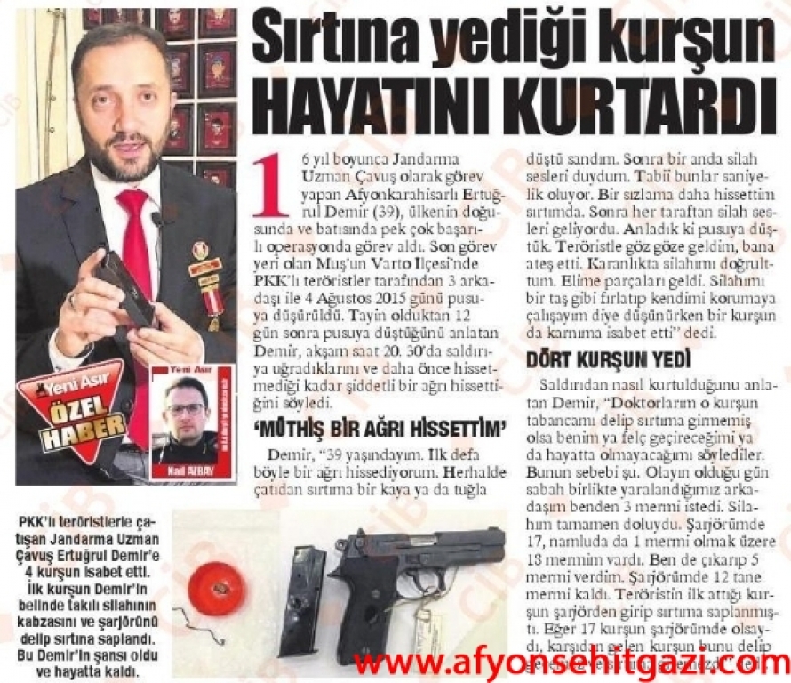 Muş’un Varto ilçesinde PKK’lı teröristler evlerine girmek üzere olan askerlere pusu atmış, o pusuda Afyonkarahisarlı Uzman Jandarma Çavuş Ertuğrul Demir’e 4 kurşun isabet etmişti. Demir ve silahı o saldırıda gazi oldu. Teröristlerin attığı ilk kurşun Demir’in belinde takılı olan silahının kabzasını ve şarjörünü delerek sırtına saplandı. Sırtına saplanan kurşunun Demir’in hayatını kurtardığı ortaya çıktı.
