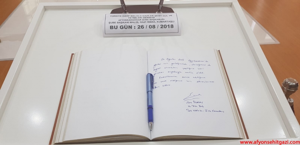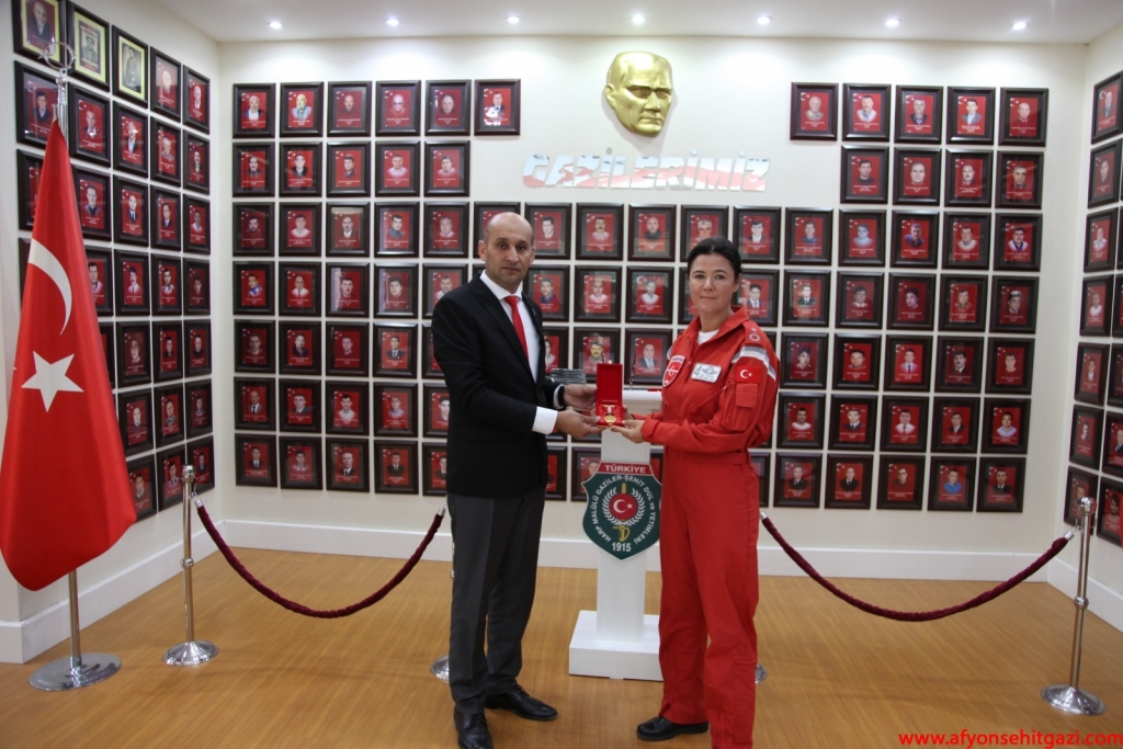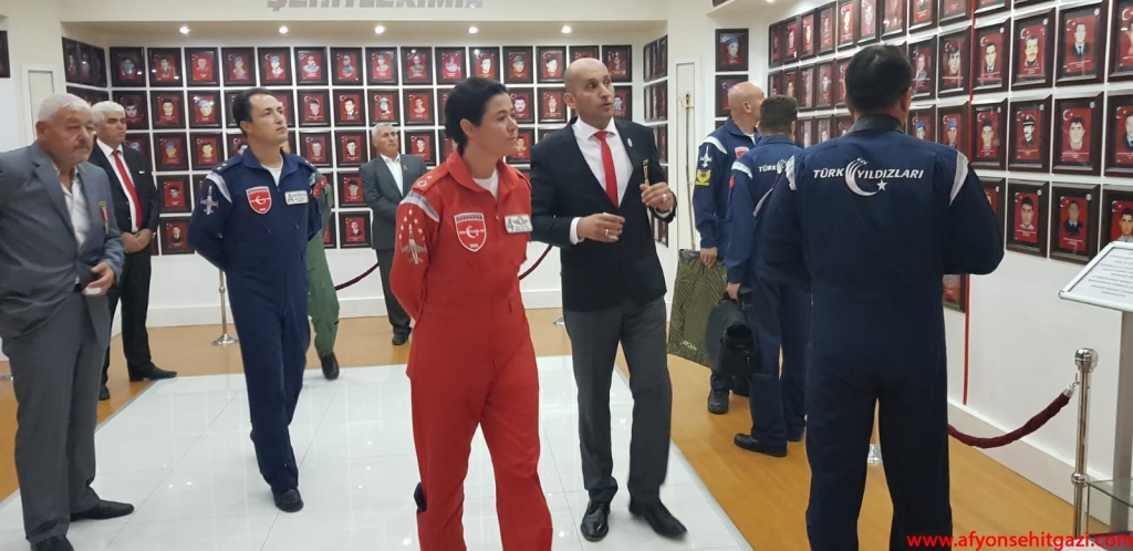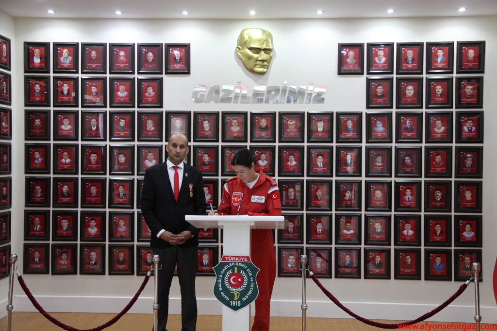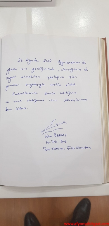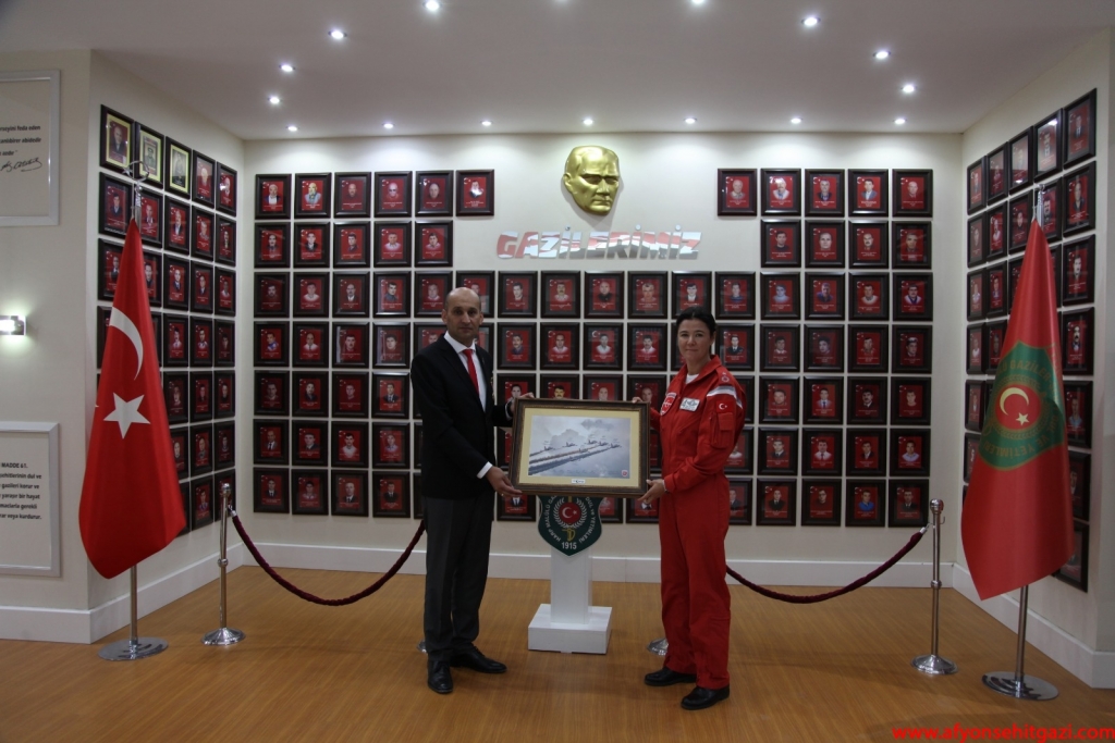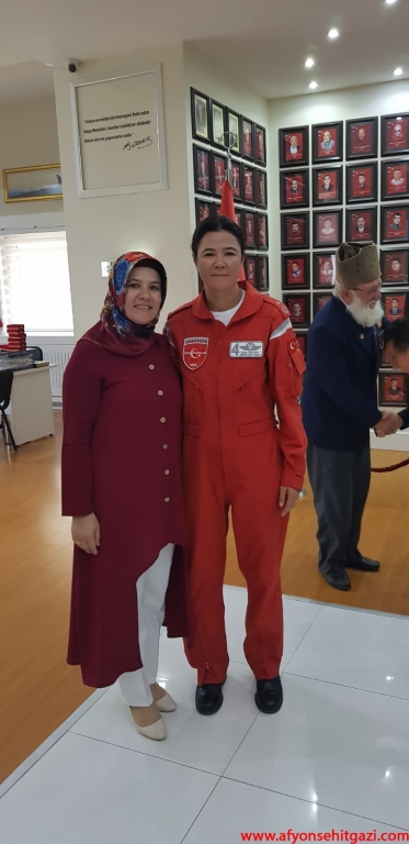 Karşılıklı bilgi alış verişinin yapıldığı ziyarette, Türk Yıldızları Filo Komutanlığına Hava Pilot Binbaşı Esra Özatay; “Zafer Haftası nedeniyle geldiğimiz ve gösteriler yaptığımız Afyonkarahisar’da Türkiye Harp Malulü Gaziler, Şehit Dul ve Yetimleri Derneği Afyonkarahisar Şubesini ziyaret etmemek olmazdı. Burada yapılan çalışma ve hizmetleri görmek bizleri ziyadesiyle memnun etti. Emanetlerimize sahip çıkıp onlara bir yuva olduğunuz için başka Şube Başkanı İsmail Kumartaşlı olmak üzere tüm yönetimine gönülden teşekkür ediyorum” dedi.