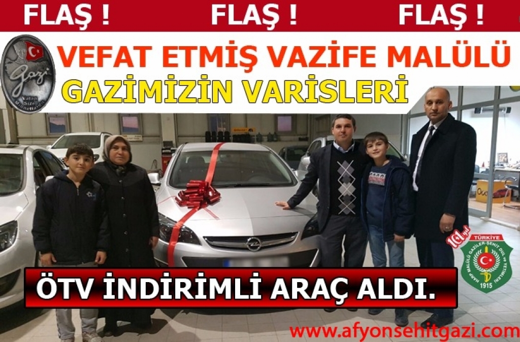 13 Ekim 2016 Tarih ve 29856 Sayılı Resmi Gazetede Yayımlanan Özel Tüketim Vergisi (3) Sayılı Liste Uygulama Genel Tebliğinde Değişiklik Yapılmasına Dair Tebliğ ile Şehit Ailelerimiz ve Vazife Malulü Gazi olup hayatını kaybetmiş olan Gazilerimizin ailelerinin ÖTV indirimli araç almalarına olanak sağlanmıştır. Bu kanunda bazı yanlış anlaşılmalar meydana gelmiş bazı yorumlarda şehitlerimiz vazife malulüdür dolayısıyla sadece şehit ailelerimiz bu kanundan yararlanabilir şeklinde yorumlanmıştır. Hatta Ankara’daki yetkili bazı mevkilerden de aynı cevap üyelerimize verilmiştir. Ama dernek başkanımız İsmail Kumartaşlı kanun çıktığı ilk günden bu güne üyelerimize vefat etmiş olan Vazife Malulü Gazilerimizin yakınlarının da araç alımından yararlanabileceğini üyelerimizi bu şekilde yönlendirmiştir.